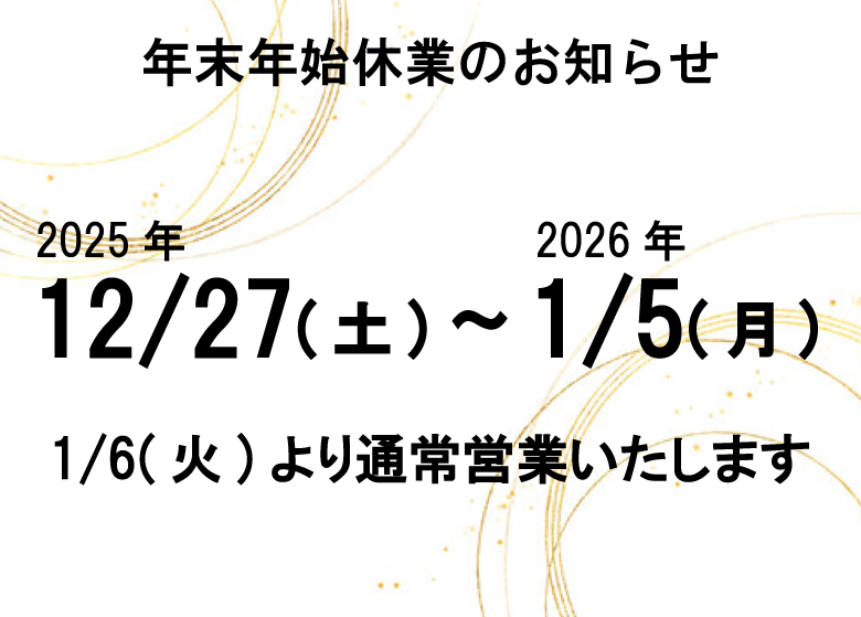誠に勝手ながら、2025年12月27日(土) ~ 2026年1月5日(月) まで 年末年始休業とさせていただきます。 年始は、2026年1月6日(火) より通常営業いたします。 2026年も変わらぬご愛顧のほど宜しくお願い申し上げます。